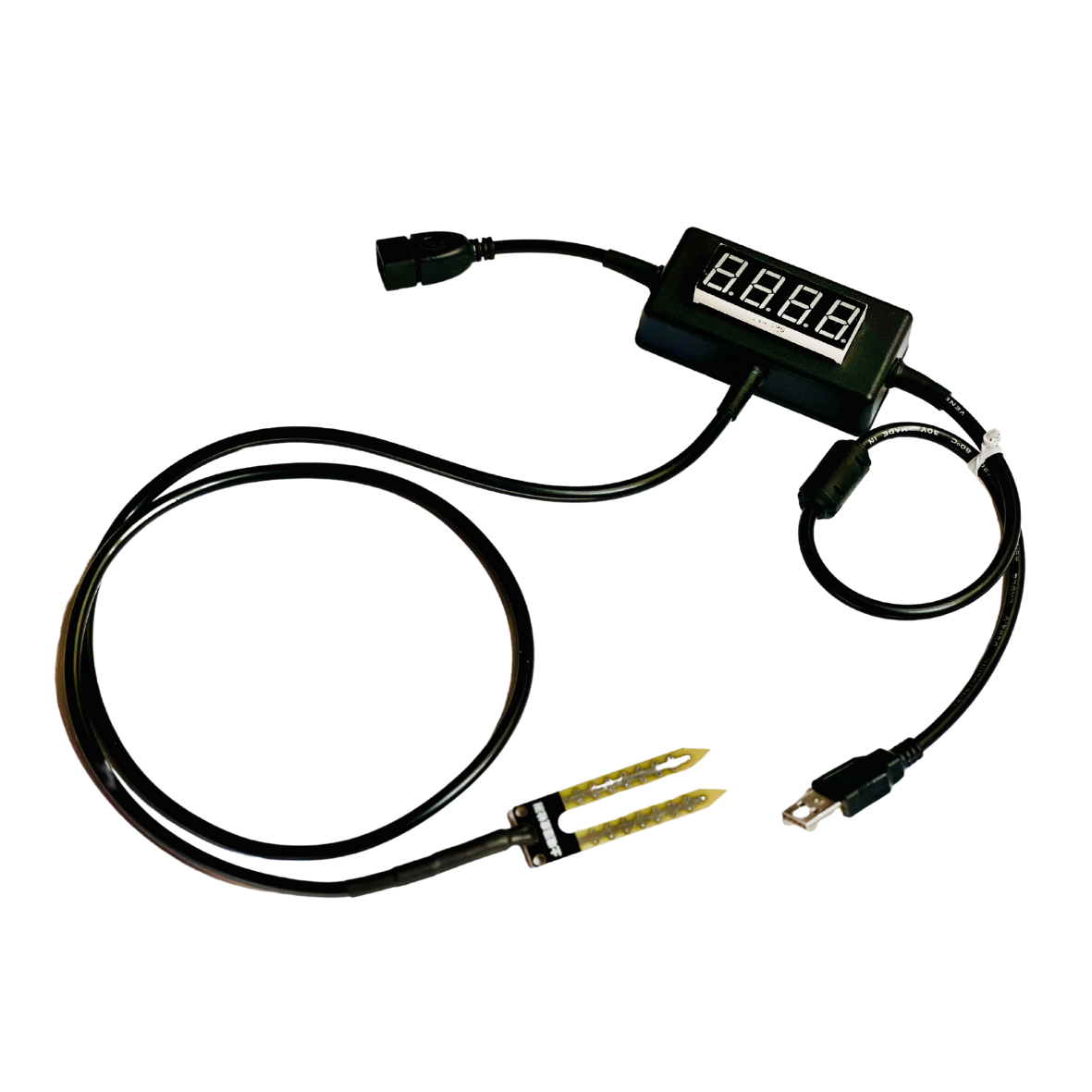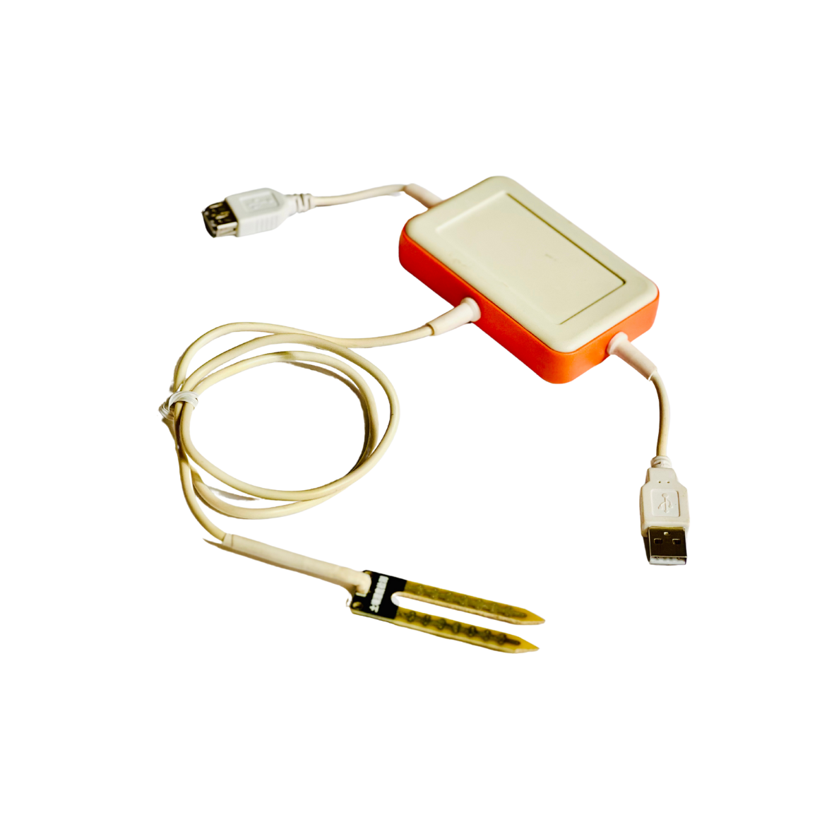 A soil moisture sensor measures moisture levels in soil, helping optimize irrigation and agricultural efficiency by preventing under- or over-watering.